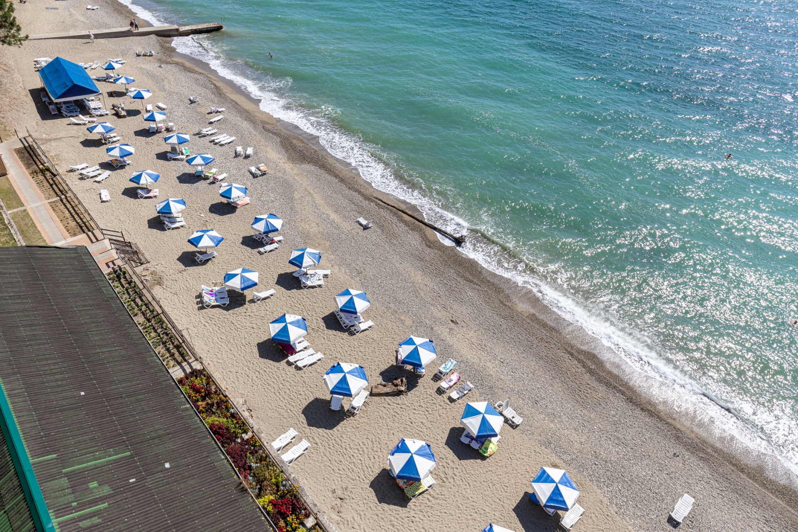 А в 50 метрах от корпуса расположен собственный пляж, длиной в 1200 метров. Гости спускаются к нему на специальном лифте, посторонних здесь не бывает. Бесплатно предоставляются лежаки и зонты, для острых ощущений можно прокатиться на банане или прыгнуть с парашютом.