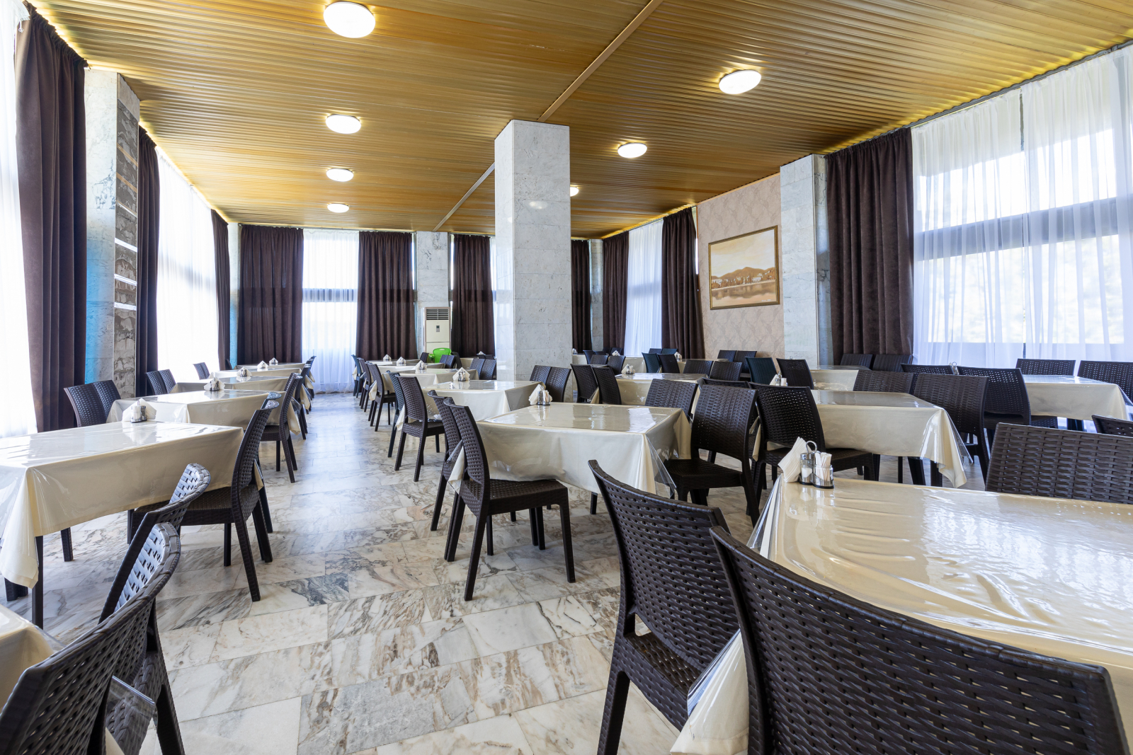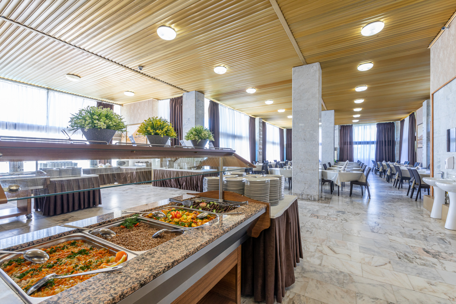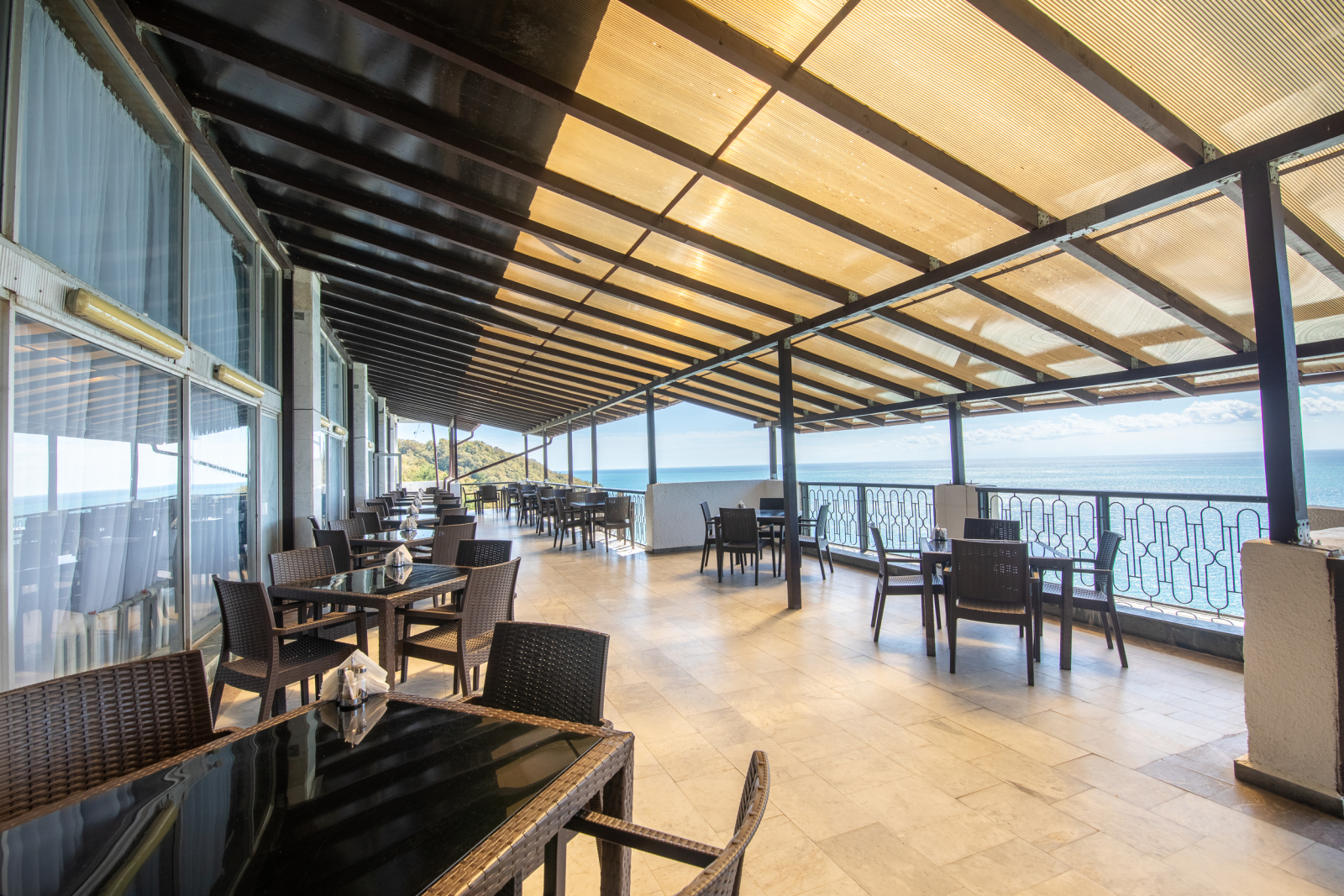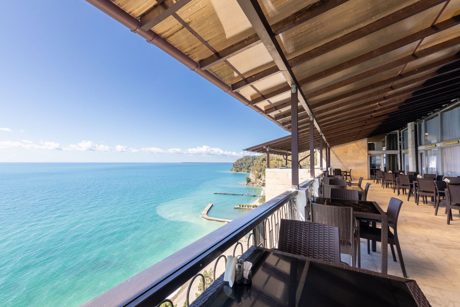 Питание для гостей организовано сытное и вкусное: 3 раза в день в формате шведской линии. Можно воспользоваться баром, пообедать на террасе или летнем кафе с видом на море.