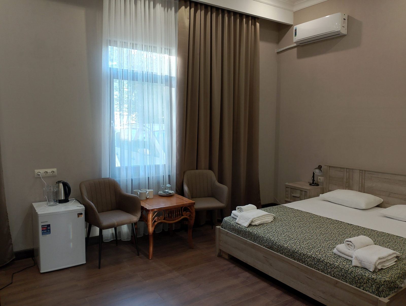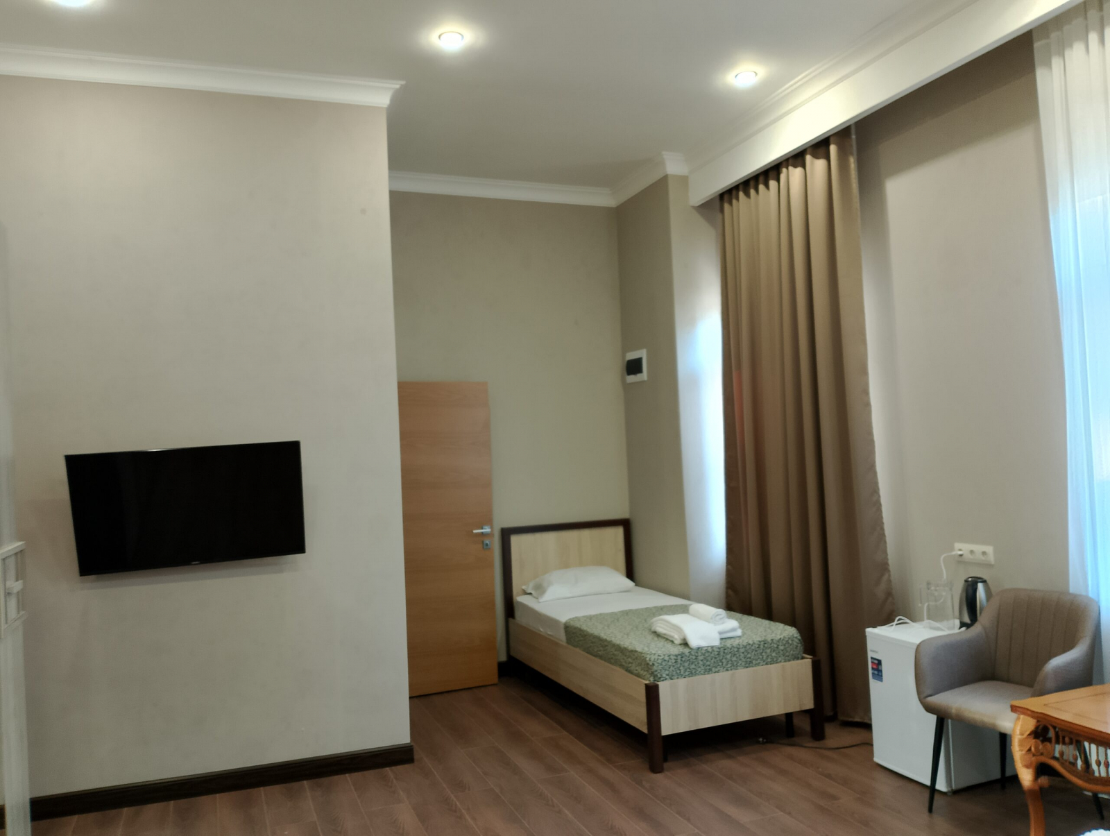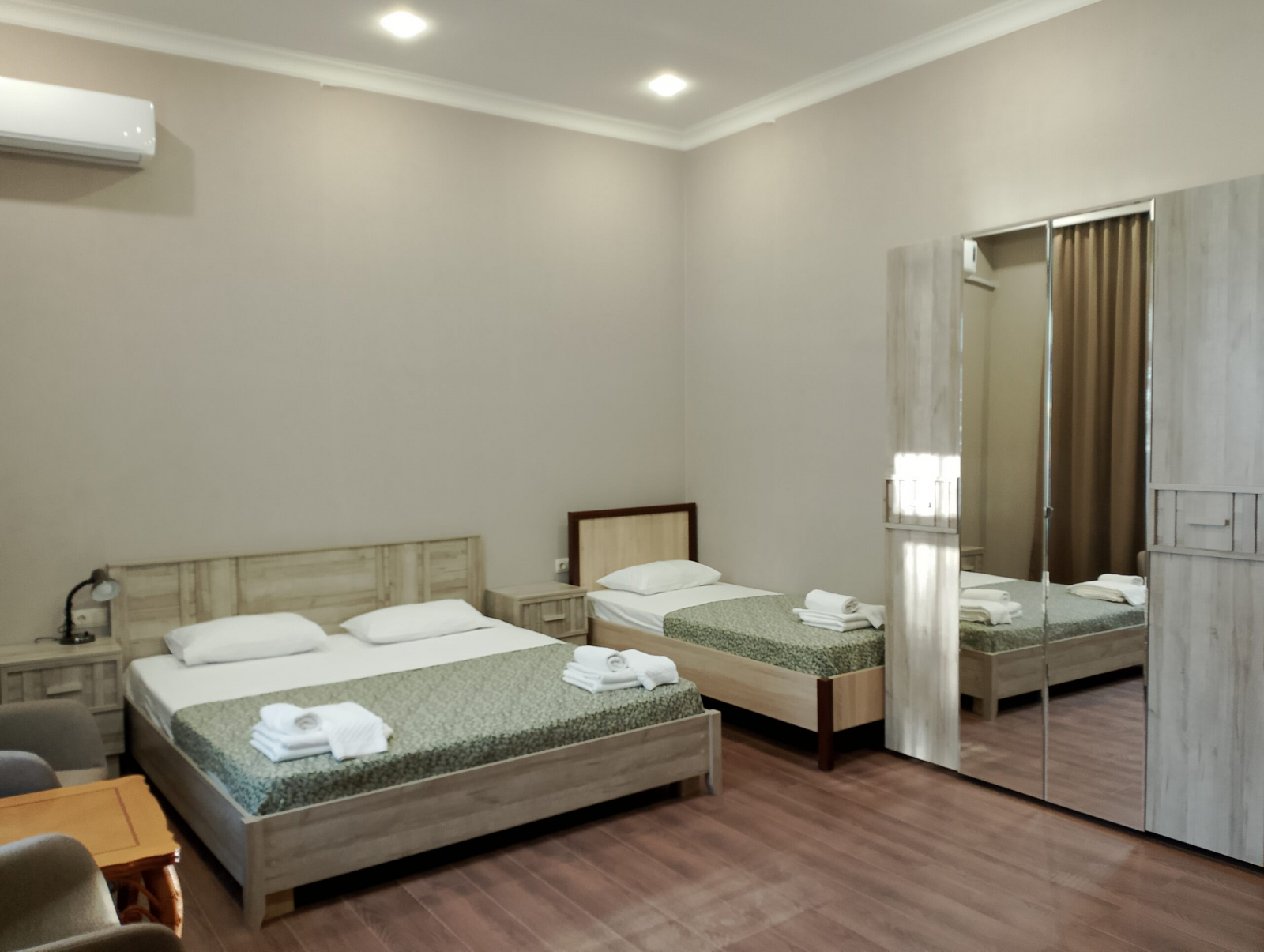 Площадь номера - 59 кв.м. 4 осн. места. 2 доп. места. Балкон. Мебель: вешалка, диван раскладной, зеркало, кресла, кровати односпальные (2), кровать двуспальная, прикроватные тумбочки, столик журнальный, стулья, шкаф. Оборудование: кондиционер, телевизор, холодильник, чайный набор посуды, электрочайник. Санузел: с душем, туалетные принадлежности, фен. Сервис: смена полотенец, смена постельного белья, уборка номера.